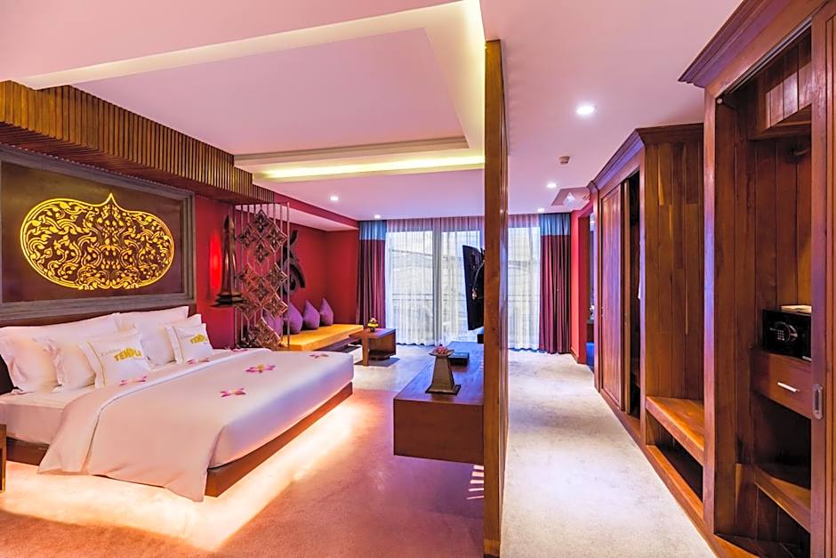 This suite features a living area and a private balcony with seating overlooking views of the swimming pool and the garden. The suite also comes with an private bathroom equipped with shower, bathtub and twin hand basins.